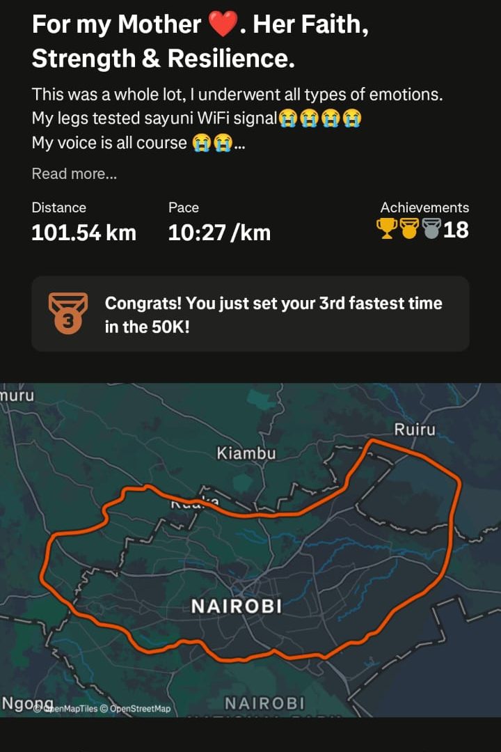 At 75km (Rubis Embakasi) I saw the support crew and my body shut down. I sat, removed my shoes, sprayed a tone of deep freeze. Took lots of soda, and water. I tried to take some crisps but I couldn’t. I decided to boost my watch charge since I was feeling so weak. It was like a five minutes break and at this point, we are not only chasing distance, but time. And when coach said its time to go, for the first time I felt like crying. 75km in, 25 to go. All right brain, let’s just get to 80 then, shall we??